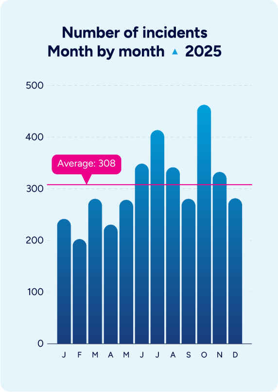 The annual total reflects that antisemitic incident levels remain significantly higher than was the case prior to 7 October 2023. CST recorded an average of 308 antisemitic incidents per month, exactly double the monthly average of 154 incidents reported in the year preceding Hamas’ attack on Israel. For the first time ever, CST recorded over 200 cases of anti-Jewish hate in every calendar month in 2025. Prior to October 2023, monthly incident totals exceeding 200 had only been reported on CST on five occasions, each coinciding with past periods when Israel was at war.