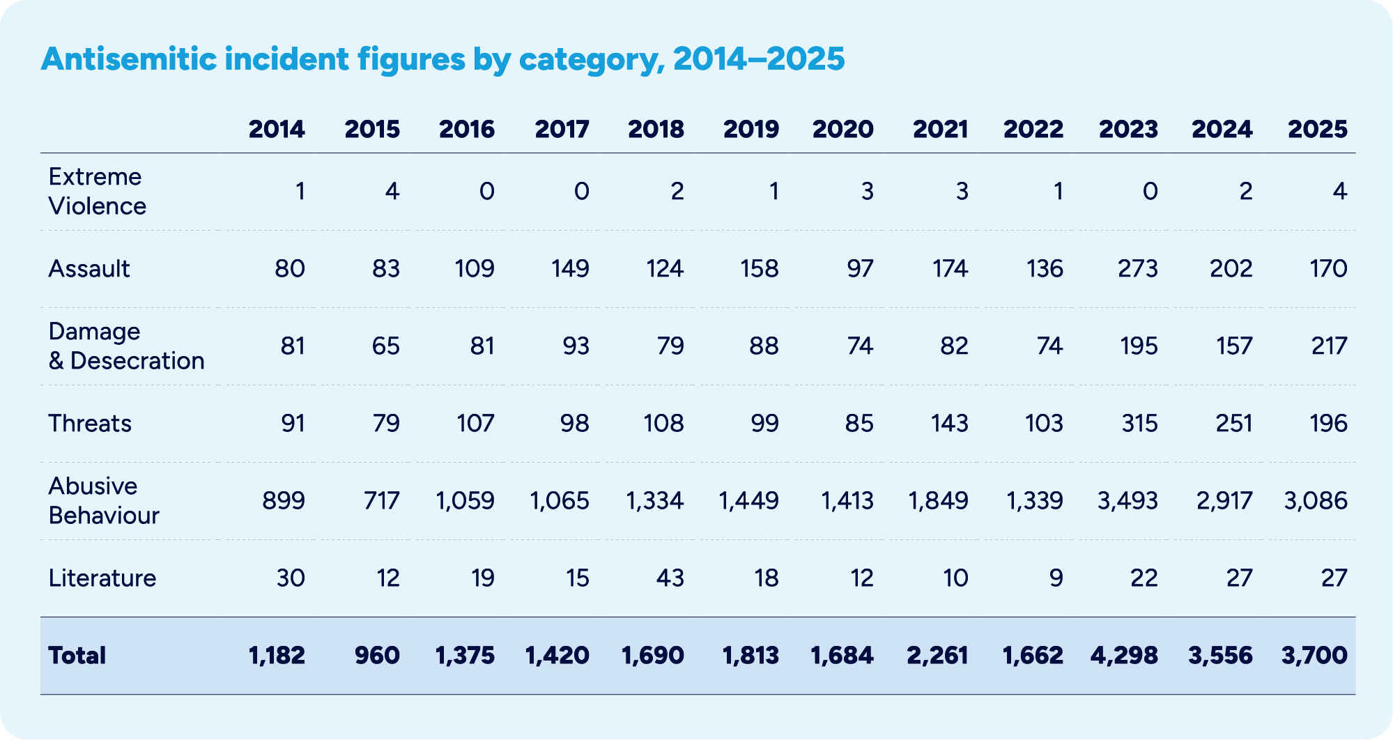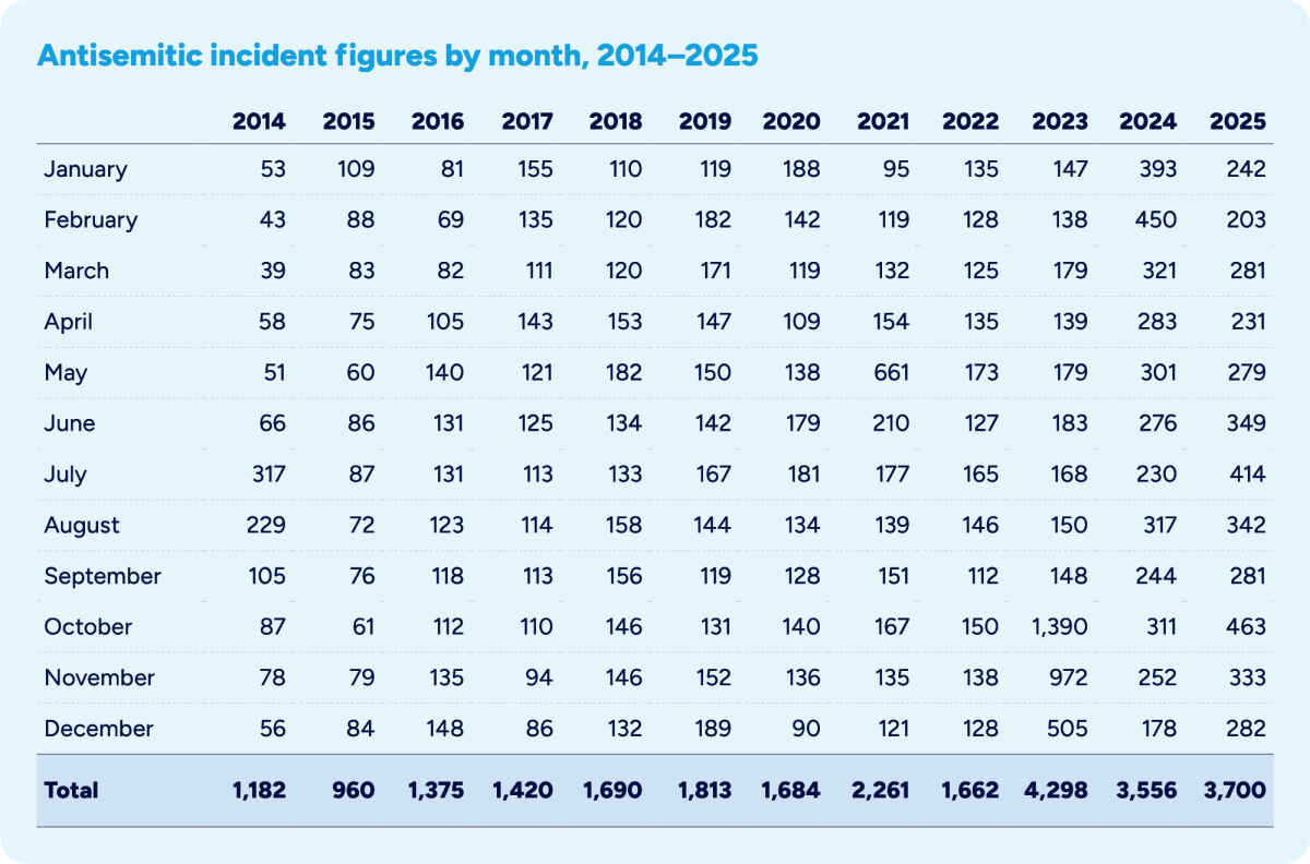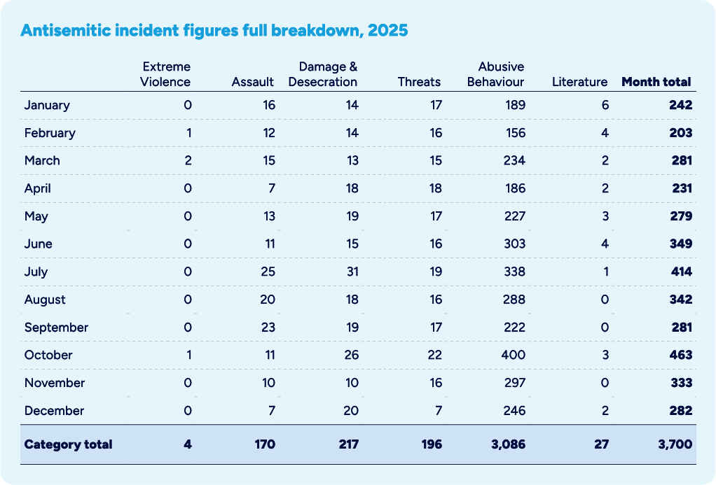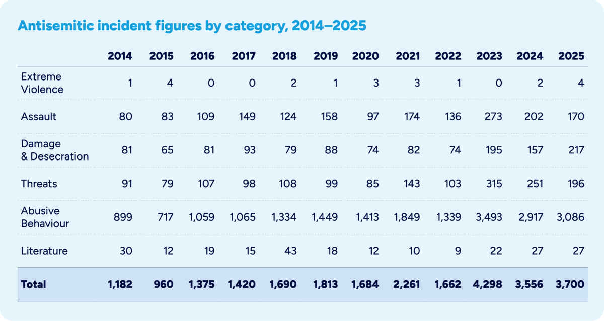 Of the 3,700 antisemitic incidents recorded by CST in 2025, 2,269 occurred in Greater London and Greater Manchester, the two UK cities where the largest Jewish populations reside.
