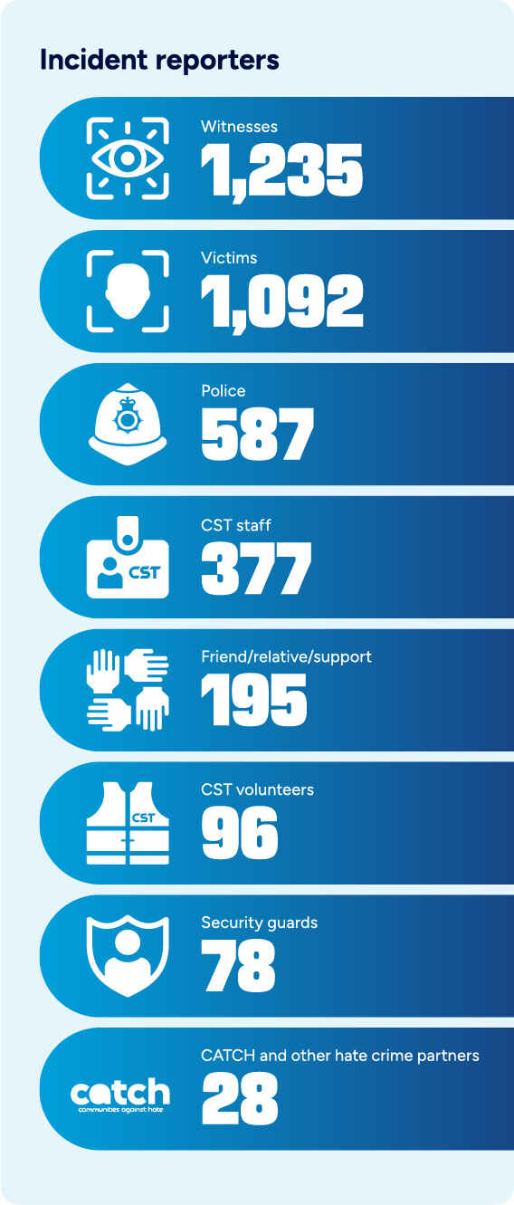 Antisemitic incidents are reported to CST in several ways, most commonly by telephone, email, via the CST website, via CST’s social media platforms, by security guards at Jewish locations or in person to CST staff and volunteers. CST staff have undergone specialist victim support training in order to provide the best possible response to incident victims and witnesses who contact CST.