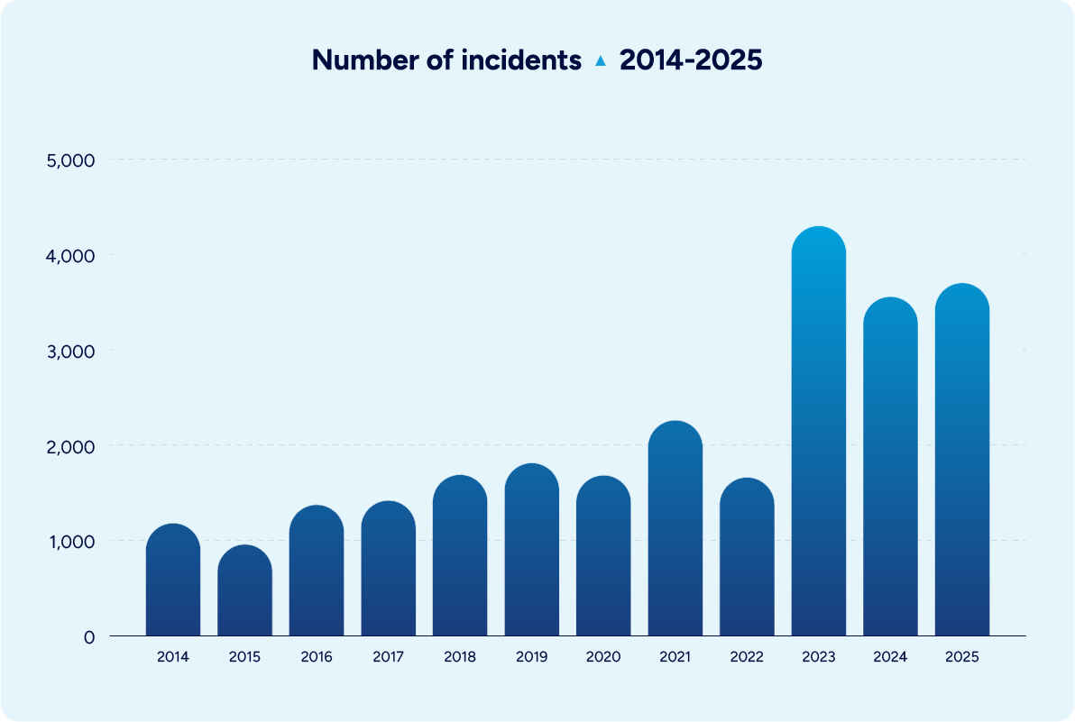 CST recorded 3,700 antisemitic incidents across the UK in 2025, the second-highest figure that CST has ever recorded in a single calendar year. This constitutes an increase of 4% from the 3,556 incidents reported to CST in 2024. CST received 4,298 reports of anti-Jewish hate in 2023 – the highest annual total on record – 1,662 in 2022, and 2,261 in 2021.