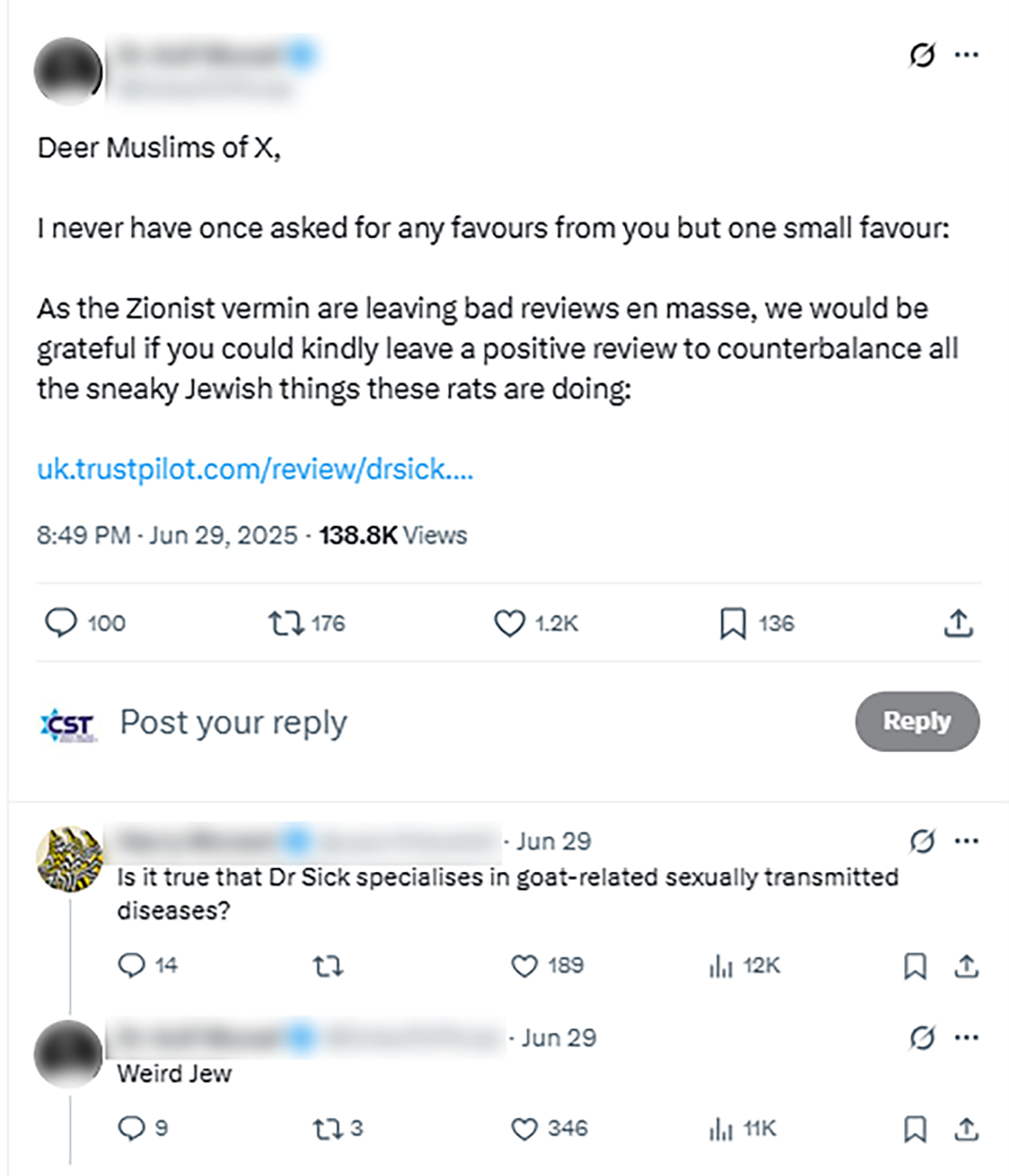 CST recorded 842 antisemitic incidents on X in 2025, more than on all other online fora combined. One hundred and ninety-seven cases of abuse occurred on Facebook; 182 via Email; 96 via text or instant messaging services, including those associated with social media platforms; 92 on Instagram; 24 on TikTok; 17 on YouTube; six on Snapchat; three involved the hacking of websites and social media pages with antisemitic content; one involved an anti-Jewish comment posted under an online news article; one on Zoom; and 80 happened on a range of other virtual sites. These figures only reflect the number of reports to CST involving each platform or medium, rather than being an assessment or approximation of the relative amount of antisemitism on each.