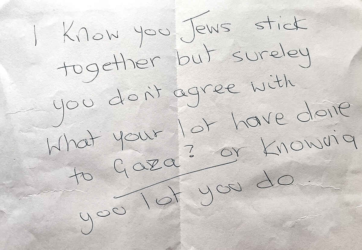 In eight of the antisemitic incidents recorded in this category in 2025, public walls were reported to have been plastered with mass-produced antisemitic posters, four of which were produced and distributed by far-right group the Goyim Defence League (GDL). On eight occasions, the offender spammed synagogues, rabbis and Jewish organisations with antisemitic emails. In two cases, anti-Israel hate mail was posted to synagogues, and there were two examples of a different identical conspiratorial letter posted at personal addresses. In two separate instances, Jewish public figures and institutions were spammed with an identical abusive comment on X; on one occasion, several university chaplains received an email filled with antisemitic and anti-Muslim conspiracy theories and stereotypes. There was one example of a far-right newspaper posted to Jewish properties in a Greater Manchester neighbourhood, one report of a book with antisemitic poetry handed out on a walking tour, one of a church newsletter showing support for Hamas and comparing Israel to the Nazis, and one incident involving a leaflet equating Zionists with Nazis at a demonstration for Palestine.