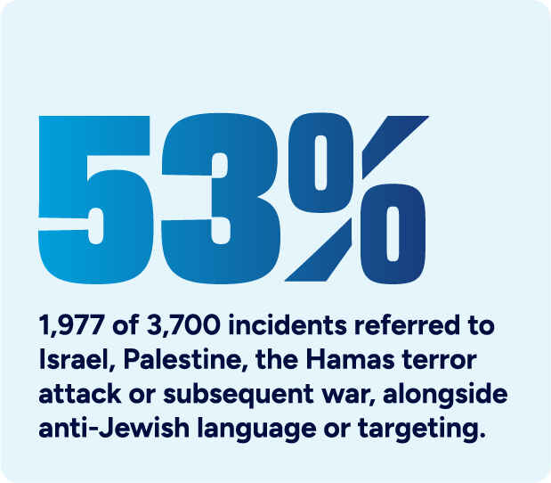 Of the 3,700 antisemitic incidents recorded by CST in 2025, 1,977 (53%) referenced, or were linked to, Israel, Palestine, the Hamas terror attack or the subsequent war. Each of these cases also evidenced anti-Jewish language, motivation or targeting. This was true of 52% of the incidents reported in 2024, 43% of those in 2023 and 15% of those in 2022: a year unaffected by a significant trigger event in the region.
