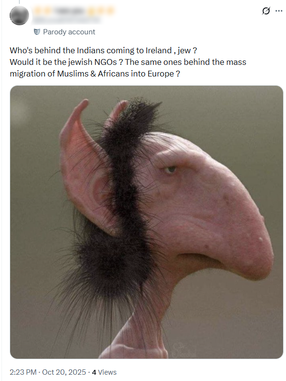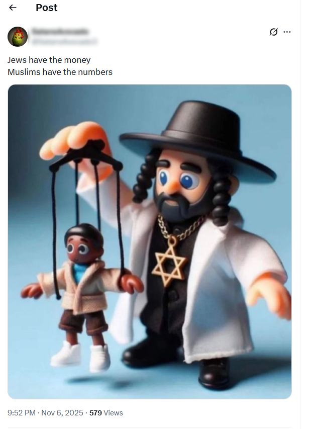 Antisemitic conspiracy theories were evident in 666 (18%) of the 3,700 antisemitic incidents reported in 2025, marking an increase in number and proportion from the 489 such incidents recorded in 2024, 14% of that annual figure. Of these, 467 alleged Jewish power over global politics, media, finance and other industries (compared to 347 in 2024); 174 spread falsehoods about religious practices, such as worshipping Satan, ritual murder and the ‘Blood Libel’ charge (up from 108 in 2024); while 18 involved conspiratorial myths regarding the origins of Jews and Jewishness in attempts to undermine the legitimacy of any concept of modern Jewish identity (a rise from 15 incidents of this nature reported in 2024).