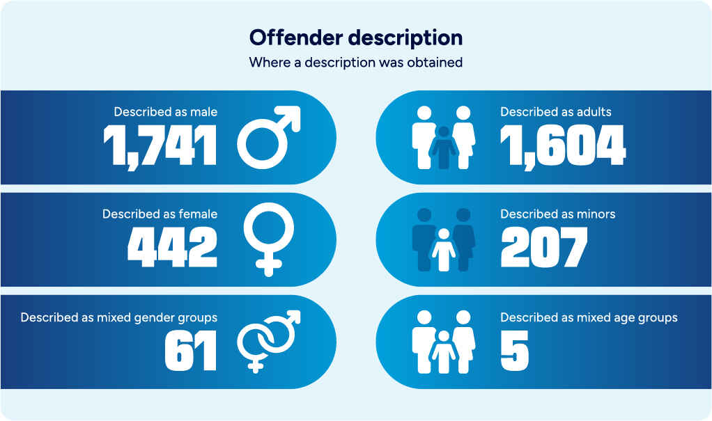 A description of the gender of the offender or offenders was provided to CST in 2,244 of the 3,700 antisemitic incidents recorded in 2025. Of these, the offenders were described as male in 1,741 incidents (78% of incidents where the offender’s gender was obtained); female in 442 incidents (19%); and mixed groups of males and females in 61 incidents (3%).