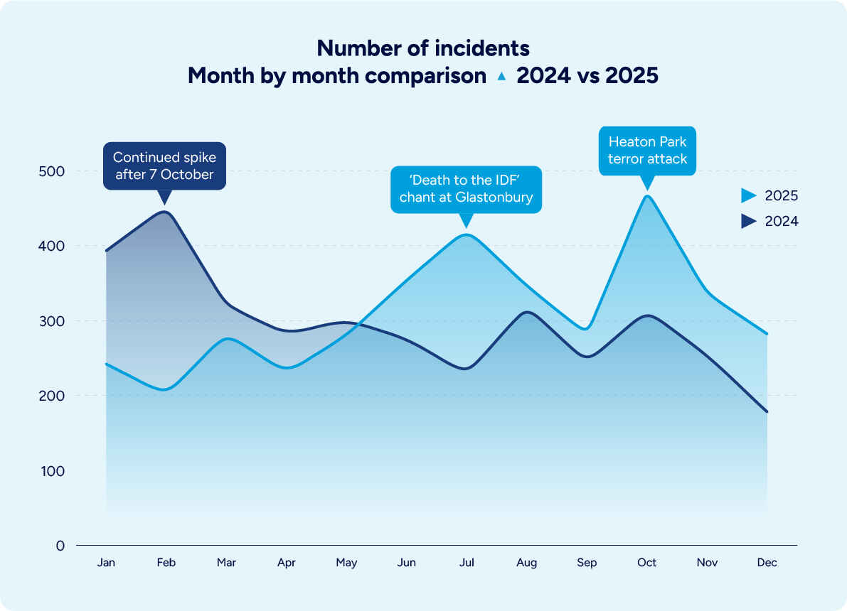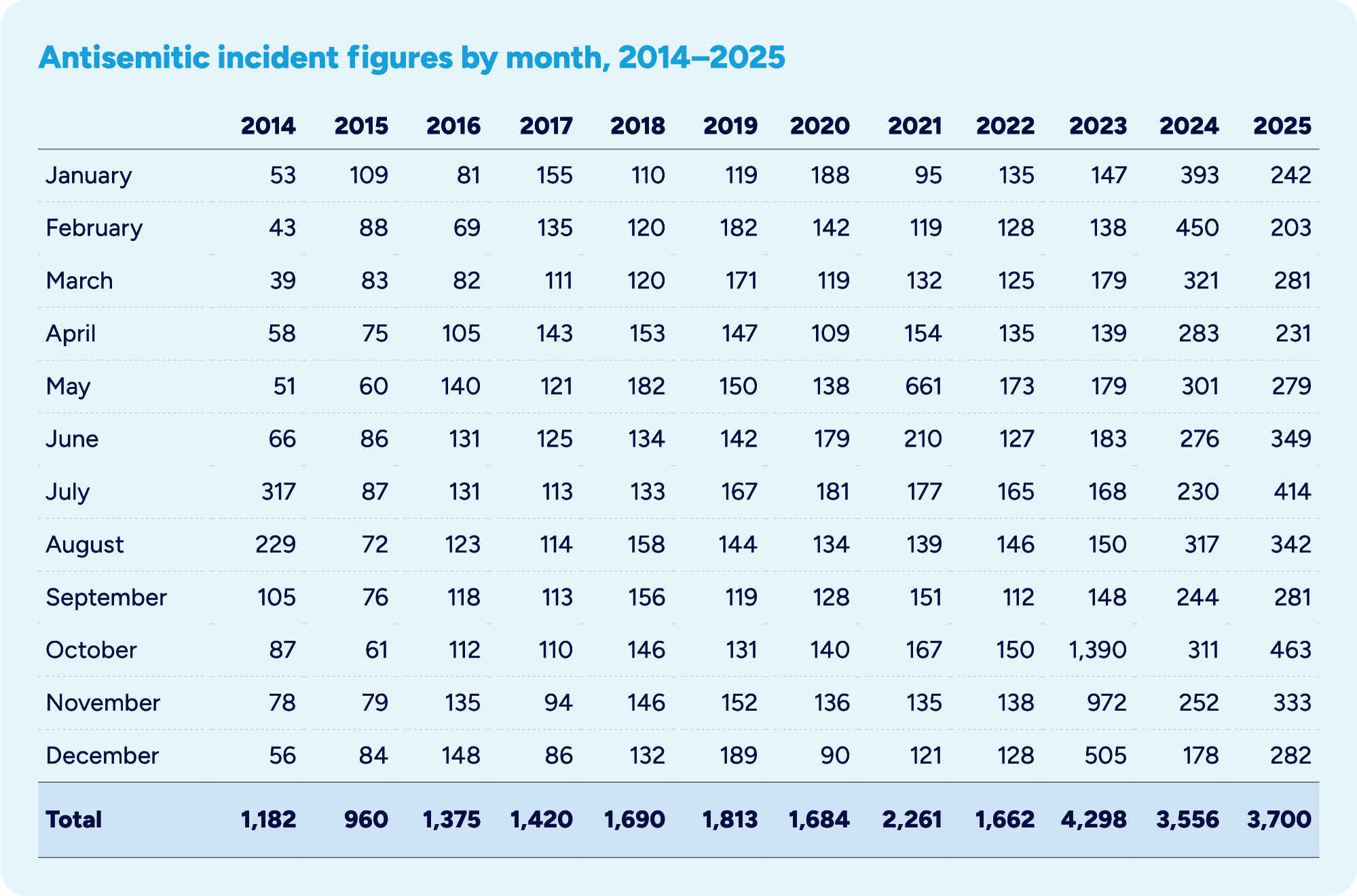 Across the calendar year, CST recorded an average of 308 antisemitic incidents per month, exactly double the monthly average of 154 incidents reported to CST in the year leading up to 7 October. Over 200 instances of anti-Jewish hate were logged in every single month in 2025, the first time that this has ever happened in a January-to-December period. Before October 2023, monthly totals surpassing 200 incidents had only occurred on five occasions, each correlating with previous periods of Israel-related conflicts.