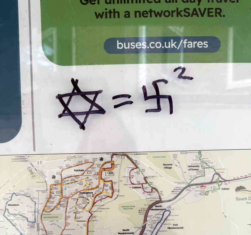 In 984 incidents – 27% of the 3,700 antisemitic incidents reported to CST in 2025 – the offender or offenders alluded to Hitler, the Nazis, the Holocaust, used rhetoric associated with the period of Nazi rule, and/or punctuated their abuse with a Nazi salute, the depiction of a swastika, or other related imagery. This is an increase of 7% from 2024, when 921 incidents – 26% of the annual figure – employed these references. Nazi-related language and symbols have historically been the most prevalent discourse in anti-Jewish hate in the UK during periods when antisemitism is not affected by Israel-related trigger events, and remain significant reference points for antisemites during periods when it is. Fifty of these 984 incidents involved minimisation of the scale of the Holocaust or denial that it happened at all, falling by 19% from 62 such incidents in 2024. In 207 of these 984 reports, the Holocaust, its perpetrators and/or their ideas were glorified, or the desire for its repeat was expressed, a rise of 47% from 139 in 2024 and more than four times the number of Holocaust denial incidents. Of these 207 incidents, 66 (32%) were also Israel-related. In these reports, offenders claimed that Israel has shown Hitler to be right about the Jews, wished for another Holocaust to put an end to Israel and Zionism, or lamented his failure to fully wipe out the Jewish population and thereby prevent Israel’s existence. On 13 occasions, the perpetrator simultaneously denied and venerated the Holocaust, a contradiction that encapsulates how confused and blurred antisemitic ideas can be in the minds of people who hate Jews. In 290 of these 984 incidents involving Nazi-related hate speech, the abuse was graffitied, daubed, scratched, stuck or printed on public or private property, usually including the graphic of a swastika. There were 253 cases wherein the offender’s far-right allegiance or political motivation were identified, 130 of which were accompanied by Nazi-era allusions, increasing from 176 and 105 such incidents respectively in 2024.16 Meanwhile, there were 387 incidents in which a direct comparison was made between Israel, Israelis or Jewish people and Nazi Germany or the Nazis, rising from 333 such instances in 2024, 257 in 2023 and 32 in 2022. Cases in which offenders drew this parallel are counted among both the totals for Israel- and Holocaust-related rhetoric, bridging the two most popular discourses employed by antisemites in 2025.
