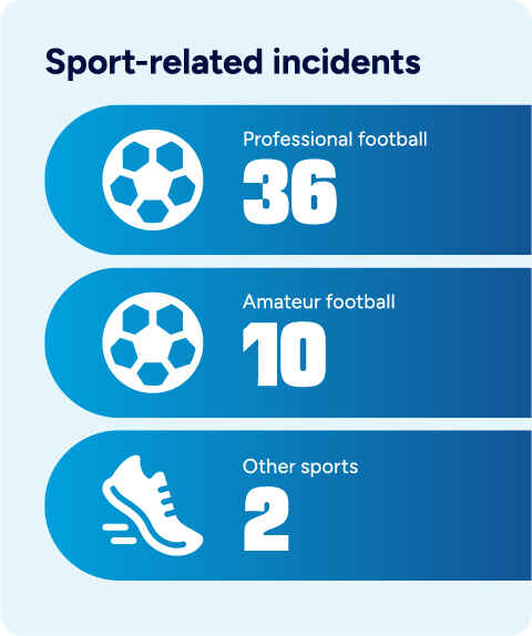 There were 36 antisemitic incidents reported to CST in 2025 that were in some way related to professional football, rising by 44% from 25 such incidents recorded in 2024. Of these, five involved anti-Jewish hate observed within a stadium, four in a non-stadium environment, and 27 were online incidents. Fourteen of these 36 incidents were antisemitic comments made in relation to West Midlands Police’s decision to ban Maccabi Tel Aviv supporters from attending a match against Aston Villa in November 2025 (13 online and one in person). CST recorded a further ten incidents in the context of grassroots or amateur football, falling from 17 incidents of this kind in 2024. There were two additional reports of antisemitism that occurred at amateur level in other sports: one in a rugby match, and one at a school sports day.