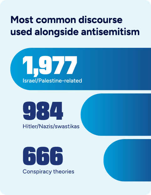 Of these 1,541 cases, 1,080 – 70% – were in some way related to Israel and the Middle East, whereas this was the case in 897 – 42% – of the 2,159 offline incidents reported in 2025. This disparity reflects the prevalence of this subject matter in online circles, and the propensity for such discussions to devolve into antisemitism. Meanwhile, at least one political, religious or antisemitic discourse, conspiracy theory, trope or ideology was evident in 1,407 (91%) of the online incidents and 1,414 (66%) of the offline incidents. While both are high percentages, virtual spaces are proportionally more likely to host politicised and extremist anti-Jewish prejudice. On these platforms, like-minded individuals are able to meet, validate and amplify each other’s hatred, and spread it freely with the protection of anonymity, often without meaningful punishment from those responsible for moderating these platforms.
