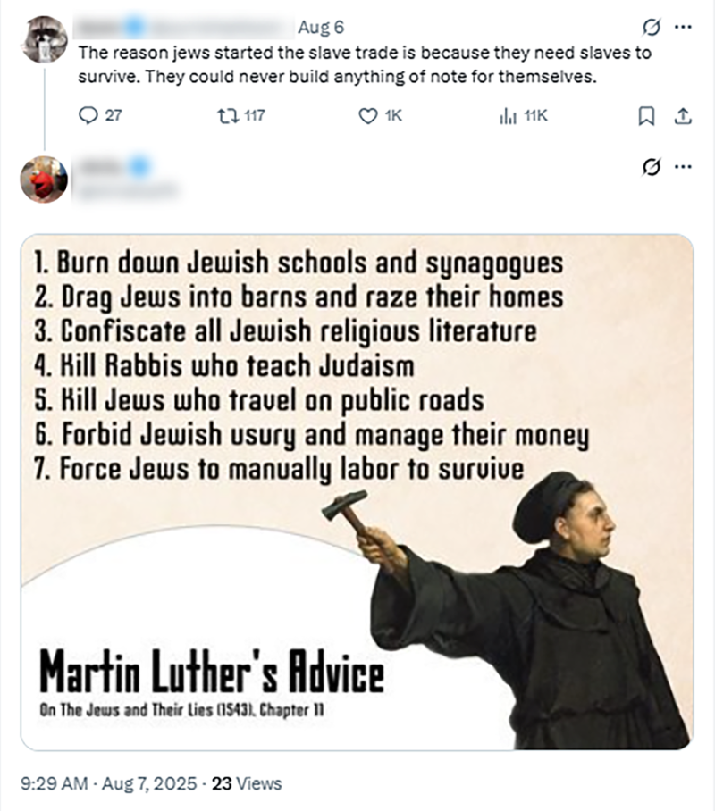 Conspiracy theories were present in 666 (18%) of the 3,700 reports in 2025, an increase of 36% from 489 (14%) of the 3,556 incidents in 2024. From these, 467 spoke of malevolent Jewish manipulation of global politics, media, finance and other walks of life, compared to 347 in 2024. One hundred and seventy-four involved lies regarding religious rituals and practices, rising from 108 in 2024. These incidents often invoke the Blood Libel myth, which has been given new life by antisemites who frame the tragic death of innocent Gazan children as a result of Jewish lust for infant blood. Eighteen incidents involved lies about the origins of Jewishness in attempts to undermine the legitimacy of any notion of a modern Jewish identity or nationhood, rising from 15 in 2024.
