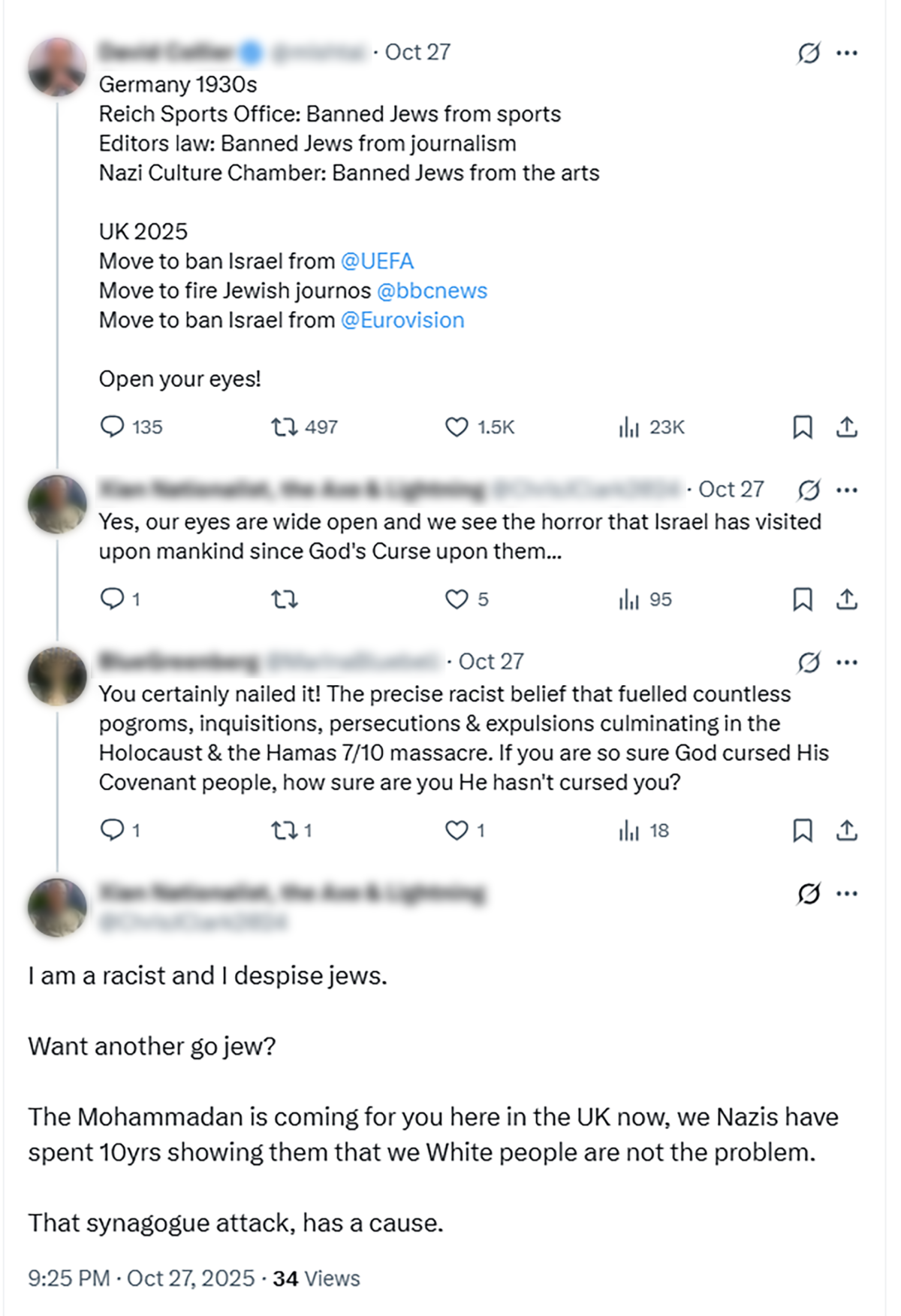 Among these online incidents in the immediate aftermath of the Heaton Park terror attack were a diverse range of anti-Jewish narratives. There was overt happiness that Jews had been targeted and killed; speculation that the attack was a false flag operation conducted by Israel and Mossad; claims that an Islamist extremist attack on a synagogue is the result of Jews facilitating Muslim immigration to displace white European populations; assertion that the death of Jewish people in the UK is nothing compared to the loss of life in Gaza, and in fact is deserved vengeance for it; and acknowledgement of the tragedy in Manchester, but argument that this tragedy may have been avoided if Jewish people spoke out against Israel, or publicly rejected Zionism.