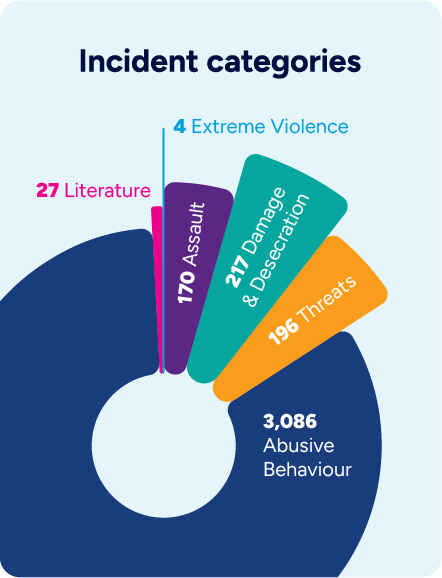 There were 196 incidents reported to CST in the category of Threats in 2025, which includes direct threats and explicit incitement of violence to people, institutions or property, rather than general abuse containing non-specific threatening language. This is a decrease of 22% from the 251 incidents of this type recorded in 2024.