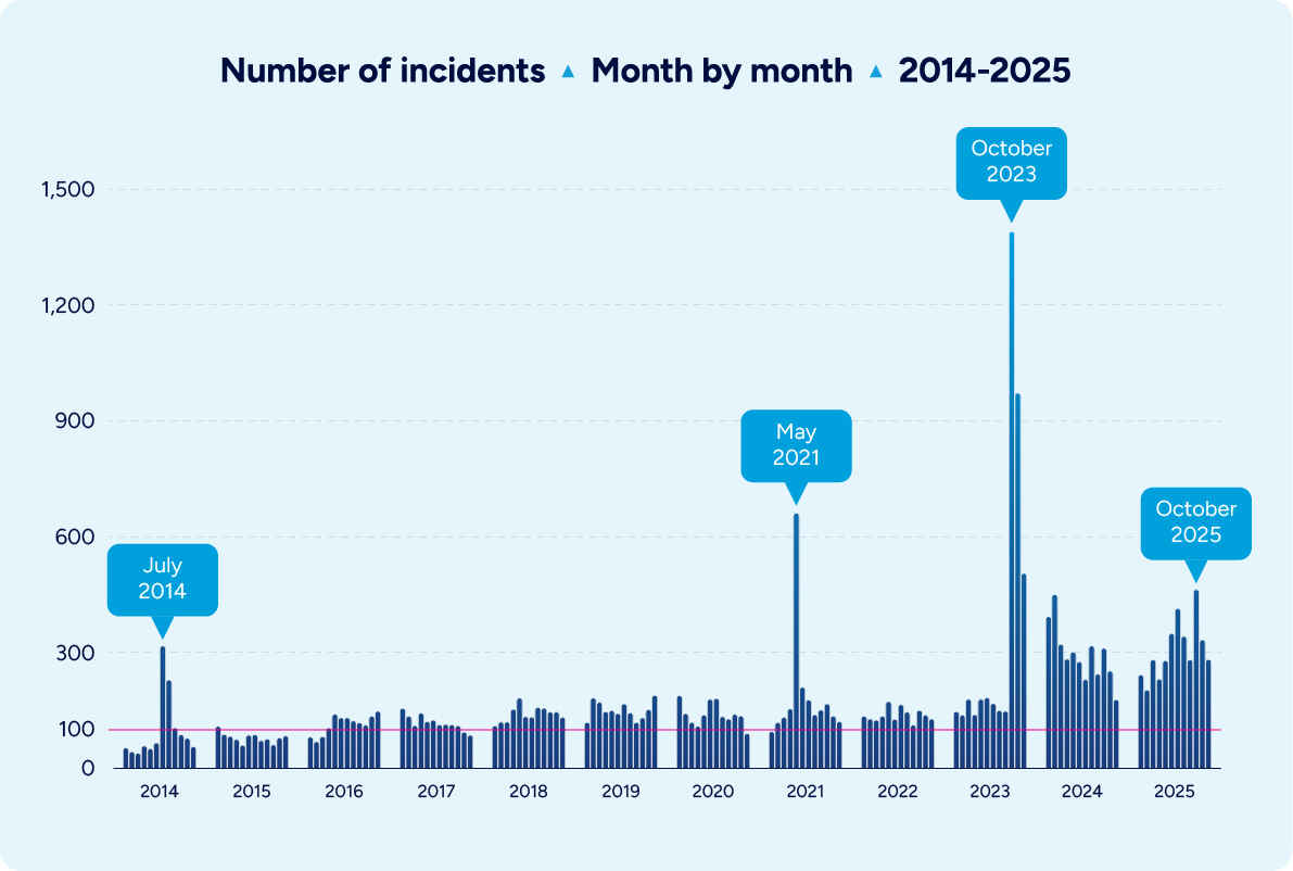 In 2025, CST recorded an average of 308 antisemitic incidents per month, exactly double the monthly average of 154 incidents reported in the year preceding 7 October. For the first time ever, CST recorded over 200 cases of anti-Jewish hate in every calendar month in 2025. Prior to October 2023, monthly incident totals exceeding 200 had only been reported to CST on five occasions, each coinciding with past periods when Israel was at war.