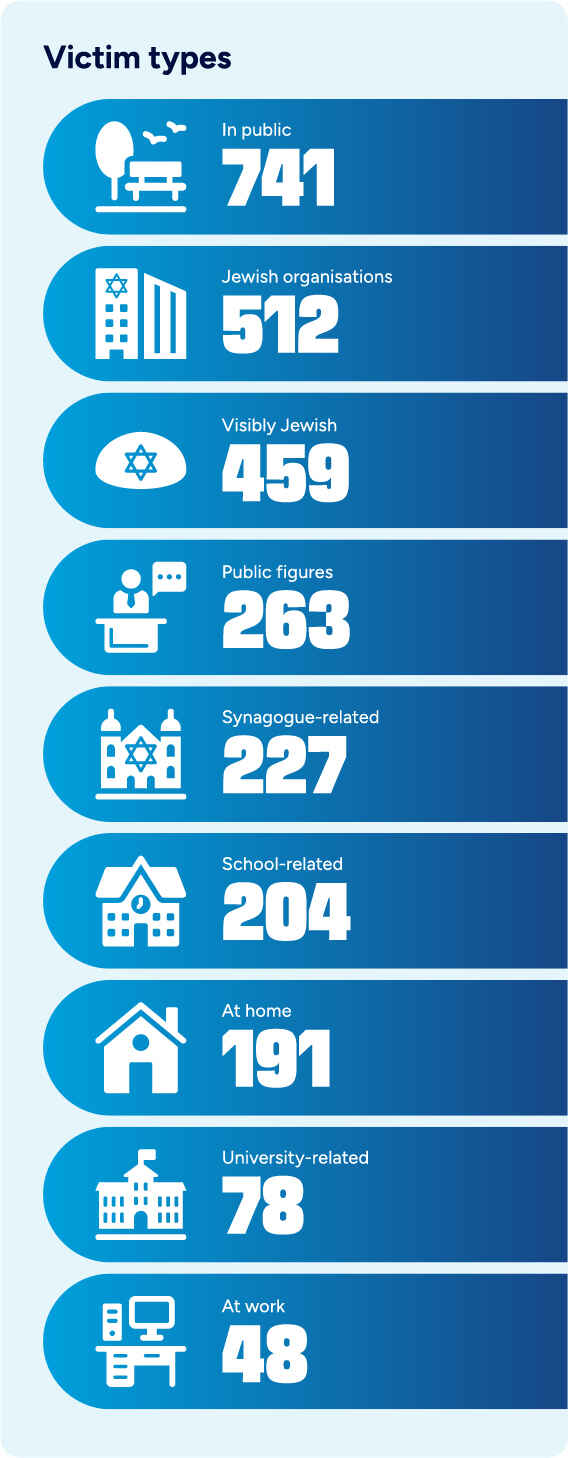 An annual record of 48 incidents were related to the workplace, rising by 45% from the 33 reports of this kind in 2024. Meanwhile, 512 incidents targeted Jewish businesses and organisations – including youth movements on five occasions – a fall of 22% from the 653 such cases in 2024, the only year in which more were reported. Public figures were targeted with anti-Jewish hate in record numbers, with 263 such incidents recorded in 2025, 47% higher than the previous yearly record of 179 such incidents logged in 2024.
